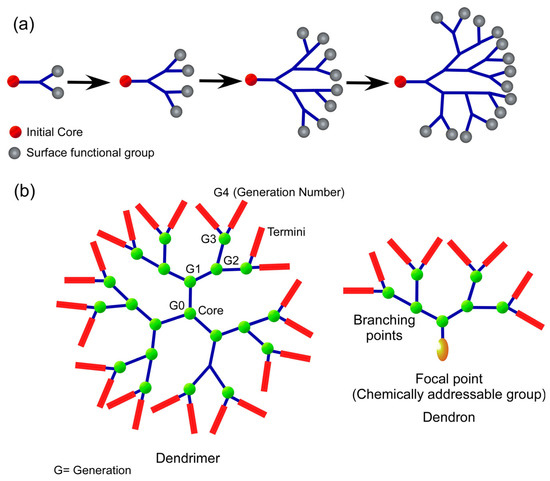 (a) Schematic design for divergent dendrimer manufacturing for drug delivery; (b) drug delivery dendrimer and dendron chemical structures.