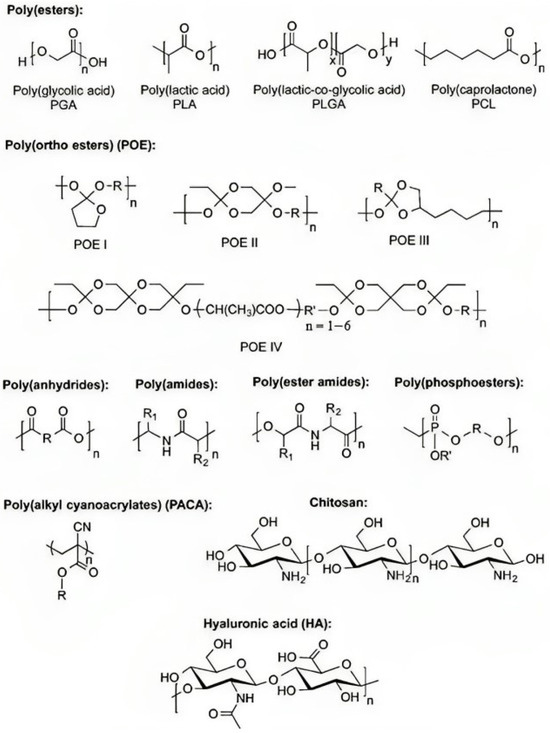 If an implant is only going to be needed for a short amount of time, the best choice for drug carriers would be bio-absorbable drug delivery devices [50]. Aliphatic polyesters are examples of synthetic biodegradable polymers. Some examples of aliphatic polyesters are PGA and PLA. PCL and polydioxanone are the polymers used as bio-absorbable drug delivery devices the majority of the time. Many other types of polymers have been developed, including polyesters, poly(ortho ester)s, polyanhydrides, and biodegradable polycarbonates (Figure 4) [51,52]. There are several types of biodegradable polymers, including hydroxy acid, polyanhydride, polyamide, poly (ester amide), polyphosphoester, poly(alkyl cyanoacrylate), PHA, and natural sugars such as chitosan. In drug delivery systems, synthetic biodegradable polymers are favoured over natural biodegradable polymers [53,54,55]. This is due to the fact that natural biodegradable polymers are immunogenic.