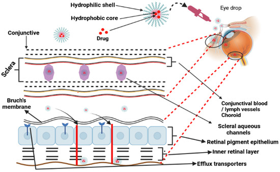 Stimuli that promote penetrability and the hold effect include monoclonal antibodies connected to the corona of the micelle or a carefully targeted ligand molecule complexed to the surface of the micelle [61]. The use of polymeric micelles may be beneficial when it comes to the administration of cancer treatments [58] and the delivery of eye medications (Figure 5) [62]. For the treatment of progressive vitreoretinopathy, polymeric micelles were encased in nanoparticles produced using the micellization of poly(ethylene glycol)-block-poly(bisphenol A carbonate). ARPE-19 cells were not affected by the cytotoxicity of the nanoparticles, which had a diameter of 55 nm. When compared to free medicines, the micellar formulation demonstrated a significant increase in the ability to suppress cell growth, adhesion, and translocation [63]. After appropriate treatments are administered, polymeric micelles are commonly injected into the posterior ocular tissues via the transscleral channel [61].