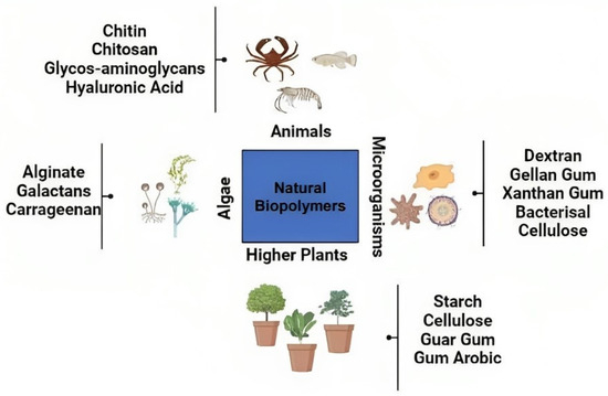 Natural biopolymers for nanomedicine applications from various sources. Natural biopolymers could come from higher plants, animals, microorganisms, and algae.