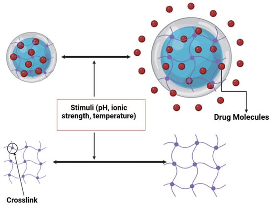 NIPAAm was copolymerized with acrylic acid (AAc) to develop temperature- and pH-sensitive hydrogels. The influence of polyelectrolytes on the LCST of temperature/pH-sensitive hydrogels was investigated within the pH range of the swelling ratio. In the same conditions and in the presence of poly(allyl amine) (PAA) as a polyelectrolyte, an investigation into the swelling ratio of hydrogels was carried out [42]. Some of the discussed subjects in the study were pH, redox responsiveness, hypoxia sensitivity, and other tumour microenvironmental-sensitive nanoparticle in situ stimuli.