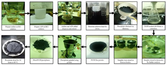 PANI was synthesized via chemical oxidative polymerization because of its convenience in preparation and processing, as addressed by many studies [2,15,16,39]. PANI was polymerized using aniline as the monomer, APS as the oxidizing agent, and HCl solution to produce high acidity media.