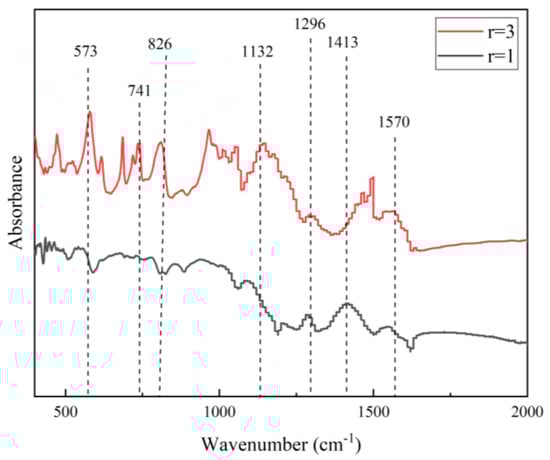 The FTIR spectra of PANI synthesized with r = 1 and higher are shown in Figure 2. The two peaks at 1413 cm−1 and 1570 cm−1 are ascribed to the C=C stretching modes of the benzenoid and quinoid rings in the PANI chain, respectively [18]. The PANI characteristic peaks observed at 1132 cm−1 and 1296 cm−1 reflect a charged amine structure between the aromatic ring and the C–N stretching vibrations of aromatic amines, respectively [42]. The peak at 826 cm−1 corresponds to the 1,4-disubstituted quinoid rings. The strong peak at 573 cm−1 corresponds to the sulfate counter ion of SDS present at r = 3. The peak at 741 cm−1 corresponds to the wag vibration of the aniline monomer N–H group [43]. In this formulation, PANI was formed in limited amounts relative to the limiting amount of APS, leaving the aniline monomer unused.