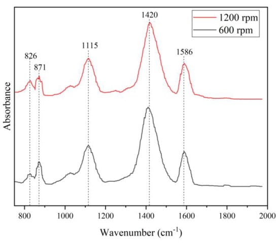 The FTIR spectra of the PANI synthesized at stirring speeds of 600 and 1200 rpm are shown in Figure 3. The double peaks at 1586 cm−1 and 1420 cm−1 correspond to the C=C stretching modes of the benzenoid and quinoid rings, respectively. The peak at 1115 cm−1 indicates the presence of an amine structure between the aromatic rings, while 871 cm−1 and 826 cm−1 correspond to the 1,4-disubstituted quinoid ring. The obvious assignment peaks of PANI were present for both stirring speeds and showed almost identical trends. The quality of PANI was not substantially affected by changing the stirring speed, which only involves mechanical action during the polymerization of PANI. A similar FTIR trend was reported by Kamarudin in 2021, where PANI synthesized with different stirring speeds showed no obvious differences [44].