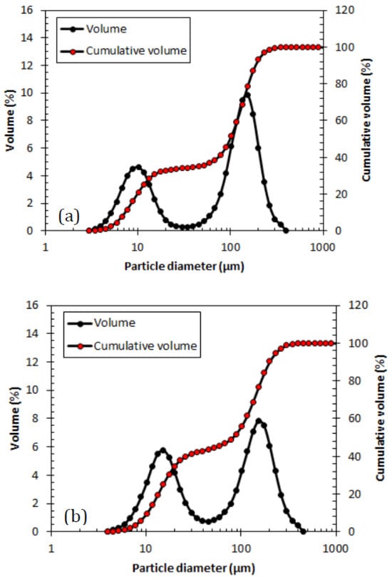 Stirring speed had an unsubstantial effect on the FTIR results. A similar conclusion was reached using the supporting data of particle size analysis for both conditions, as displayed in Figure 4, which shows the plots of volume and cumulative volume versus particle diameter. Both samples show a binomial distribution. At a stirring speed of 600 rpm, 65% of the particle population is large, whereas at 1200 rpm, the populations of large and small particles are equal.