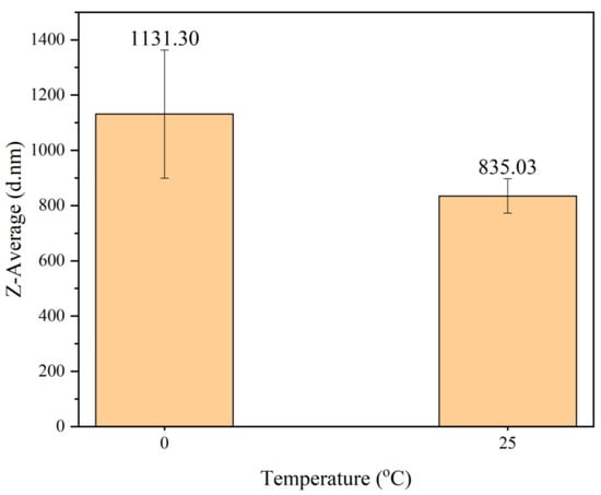 The results of a particle size analysis of PANI synthesized at 0 °C and 25 °C are shown in Figure 5. The particle sizes of PANI synthesized at 0 °C and 25 °C were 1131.30 nm and 835.03 nm, respectively. According to Aribowo in 2018, synthesizing PANI at lower temperatures increased the molecular weight and crystallinity [31]. Because the polymerization of PANI is exothermic, the reaction period is bound to be longer at lower temperatures and vice versa [45]. Holding a lower temperature results in the formation of large particles because an increase in crystallinity increases crystallite size; hence, an increase in particle size was expected [31,32]. Because it resulted in a smaller particle size, faster reaction time, suitability for implementing SDS in polymerization, and better temperature control, PANI was further synthesized at 25 °C instead of 0 °C. These advantages are important, particularly for the large-scale production of PANI.