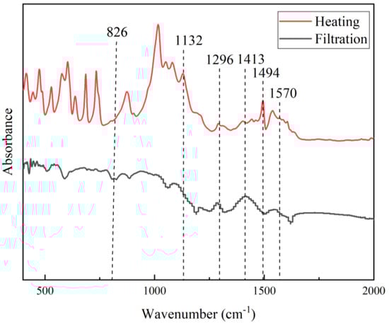 The FTIR spectra of PANI purified via filtration or heating are shown in Figure 6. Both spectra exhibit the characteristic peaks of PANI, but they differ notably in some shifting and absorbance intensities. The peak at 1494 cm−1 showed an increased intensity, indicating a higher quinoid structure upon heating [42]. The peak at 1413 cm−1 is ascribed to the benzenoid ring stretching mode of C=C. A higher intensity was also observed at 1296 cm−1, while a lower intensity was observed at 806 cm−1. Purifying PANI via heating results in many additional unidentified peaks. Other substances were produced because of the prolonged heating of PANI. Heating has a much lower tendency for product loss, resulting in a better yield of PANI.
