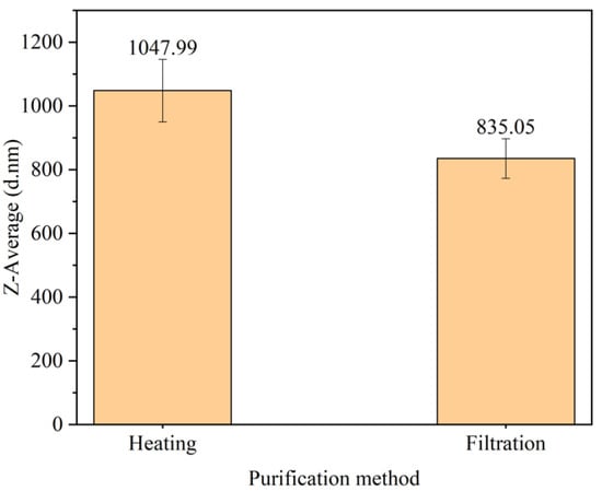 The particle sizes of PANI purified via heating and filtration are displayed in Figure 7. Purifying PANI via heating produces a larger particle size of 1047.99 ± 98 nm compared to 835.05 ± 62.12 nm using the filtration method. In Figure 6, the additional peaks in the FTIR data when the heating method was used are attributed to the presence of additional substances in PANI. This result explains the presence of other unknown substances that contribute to the size of PANI. Differences in the yield were also observed, with heating providing a higher yield than the filtration method, as displayed in Table 5. During heating, product loss was minimized because the process occurred in the same batch [34]. The filtration method was preferred because of the presence of characteristic PANI peaks and smaller particle sizes.