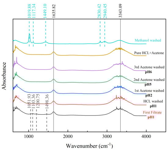 The selection of the washing method for PANI is important for removing unreacted substances, intermediates, and by-products [31]. The removal of these undesired substances is necessary to produce good-quality PANI with beneficial properties. The FTIR of the filtrate was investigated at each stage of washing with specified arrangements, as displayed in Figure 8.