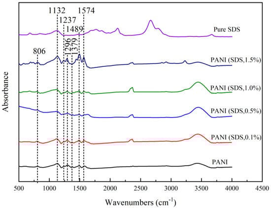 The representative spectra of the PANI powder samples synthesized with different concentrations of SDS are illustrated in Figure 10. The presence of the broad vibration band of water molecules at 3425.65 cm−1 in all spectra indicates high humidity during measurements [32]. The bands at 1574 cm−1 and 1489 cm−1 refer to quinoid (Q) and benzenoid (B) ring stretching vibrations, respectively [42]. A small band attributed to the stretching vibration of the C–N group near the quinoid ring can be observed at 1379 cm−1. The band that can be observed at 1296 cm−1 is due to C–N 1 washing vibrations of aromatic amines linked with para-link aniline units, a common and well-established PANI chain position linkage. The peak at 1237 cm−1 is attributed to C–N vibration in the strong band, representing a vibrational mode of the charged imine structure (-NH+=) between quinoid and benzenoid rings. This peak indicates the presence of a positive charge in the backbone of PANI or in the conducting emeraldine form. This peak also exists in the spectrum of the SDS powder sample, ascribed as a -CH in-plane vibration [18]. The band at 806 cm−1 observed in the spectrum of the PANI sample synthesized with and without PANI is attributed to the 1,4-disubstituted ring or quinoid ring deformation. The spectra of PANI and PANI synthesized via SDS show almost identical trends, denoting that the surfactant was removed in the final product. Washing PANI with 0.2 M HCl, acetone, and distilled water is important in surfactant removal, as no surfactant fingerprint was imparted in the FTIR. Similar observations were also made when using TX100 as a surfactant in PANI synthesis.
