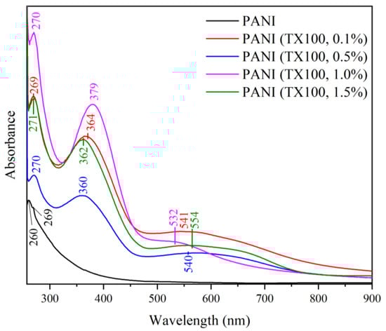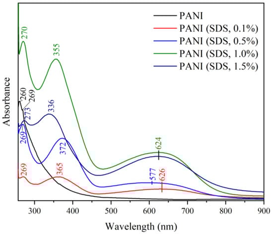 The UV-Vis spectra of PANI synthesized with different loadings of a surfactant, namely, SDS and TX100, are shown in Figure 12 and Figure 13, respectively. Two absorption bands at 260 and 269 nm can be observed in the UV-Vis spectrum of PANI synthesized freely without a template or surfactants. These bands are attributed to the π–π* transitions of the benzenoid ring of the PANI backbone [45,50,51]. The washing process increased the solution pH and decreased the acidity of the PANI powder. This decrease in acidity reduced the doping of the PANI backbone. This reduction is corroborated by the absence of an absorption peak in the range of 400 to 450 nm, indicating the doping level of PANI, which is typical in PANI salt [52]. PANI synthesized with SDS and TX100 displays a typical PANI emeraldine base spectrum comprising two peak ranges from 330 to 380 and 510 nm to 610 nm. The first peak range is assigned to a π–π* transition of the phenyl ring, which corresponds to the excitation of the amine nitrogen (-NH-) near the benzenoid ring of PANI. The second peak range is ascribed to an n–π* transition corresponding to the excitation of the imine nitrogen (-N=) of the quinoid segments [53]. This trend is consistent with reports of PANI dispersion in NMP in multiple studies in the literature [50,51].