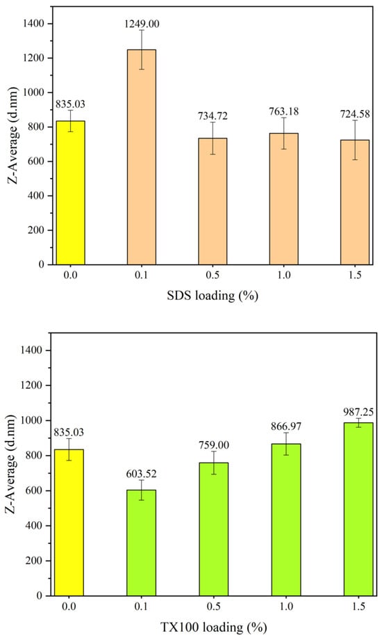 The top of Figure 14 presents the particle sizes of the respective PANI synthesized via the application of the anionic surfactant SDS. The bar in yellow colour indicated for PANI synthesized without surfactant while brown colour and green colour meant for SDS and TX100, respectively. The particle diameter (measured in nm) indicates the Z-average or the mean of the particle size distribution. The control sample, PANI synthesized without the presence of a surfactant, shows a particle size of 835.03 nm. The average particle size of PANI was considerably increased to 1.25 μm when 0.1% SDS was used. This result exceeds the size limit of a colloidal particle, which must be lower than 1.00 µm. Further increasing SDS loading in synthesis slightly reduced the particle size, with the lowest being recorded at 1.5% loading. SDS acts as a surfactant to assist in reducing PANI particle size at certain loadings [30,31,32]. Consequently, the SDS surfactant was less effective in reducing PANI particle size, and even colloidal PANI particles were produced at higher surfactant loadings.