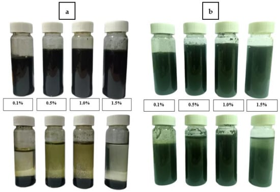 Sample homogeneity was clarified by dispersing a small amount of PANI powder in distilled water and leaving it for seven days to observe the stability of the dispersion upon settling, as shown in Figure 15a,b for PANI–SDS and PANI–TX100, respectively. PANI–SDS dispersion produces foam at the surface, indicating a small amount of SDS surfactant. After being left inside vials for seven days, 0.1%, 1.0%, and 1.5% PANI–SDS dispersions underwent sedimentation, indicating large particles of more than 1.0 µm. An unstable dispersion and poor dispersibility should result from a larger particle size, as observed via DLS. The particles settled due to gravity over time. The PANI–TX100 dispersions were more stable, as no phase separation was observed. This result was supported by the smaller particle size of PANI.