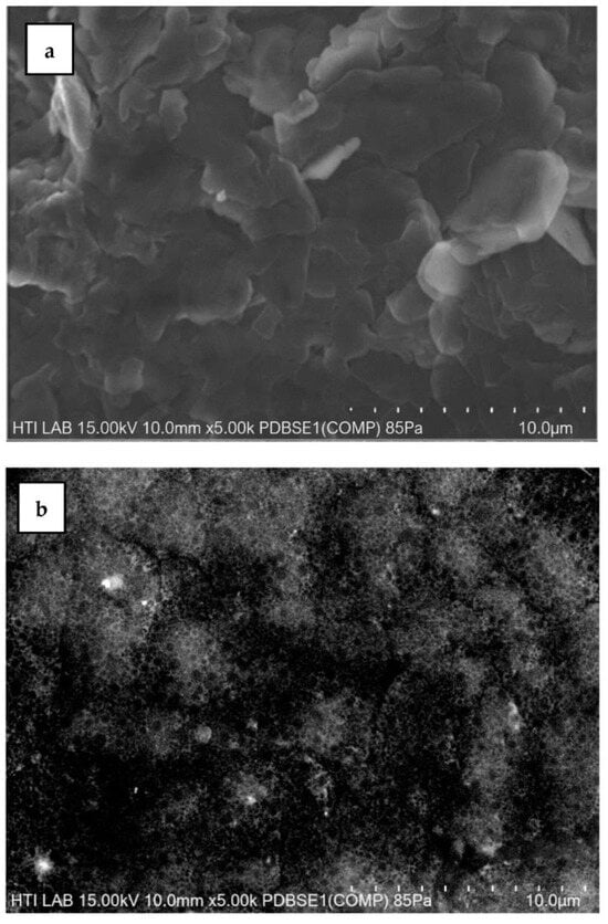 The morphologies of the PANI powders is displayed in Figure 16. A PANI powder sample synthesized at a stirring speed of 1200 rpm was selected to represent micron-sized PANI and compared with a sample synthesized under optimized conditions. Figure 16a reveals that the former PANI has a flake shape with an average width of 3.282 nm and an average length of 8.358 nm. The morphology comprised the irregular shape of PANI, and the size is similar to the particle size identified using DLS. Similar outcomes were observed when PANI was synthesized without controlling the parameters, consequently producing a micron-sized PANI flake [18,45,54]. The mean diameter of PANI measured via DLS was 10 µm for the small population group, while the large population group had a diameter of 152 µm. Different morphologies of PANI are shown in Figure 16b, with a granular shape and good distribution. The granule has an average diameter of 695 nm, indicating that the nanosized PANI was synthesized under optimized conditions.