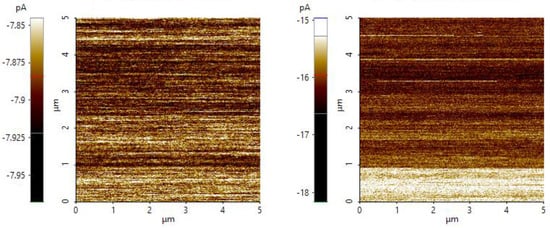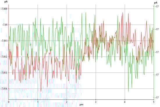 AFM images representing the current flow profiles of PANI at different particle sizes are shown in Figure 17. The conductivity, indicated by the current flow range, is represented in the left panel. A lower current magnitude is indicated by white, and a higher magnitude is indicated by dark brown. The micron-sized PANI shows a lower range of current (−7.85 to −8.00 pA) flowing through the powder. The nanosized PANI shows a higher magnitude of current, with a range from −15 pA to −18 pA. The negative value of the current shows that PANI is connected to the back of a metallic disk [55]. The obvious difference in the magnitude of current flow for different particle sizes of PANI shows that particles with higher aspect ratios are important for yielding larger conductivity. Nanosized materials are favorable for many applications because their conductivity can be optimized. Current flow is improved by 108% when nanosized PANI is produced. The distribution of current flow is explained by the current flow profile across the 5 µm2 scanned area, as shown in Figure 18. The micron-sized PANI, represented by the red line, shows a current with an average value of −7.913 pA in the first half area and a decrease below −7.910 pA. The uniformity of current flow is more defined in the nanosized PANI.