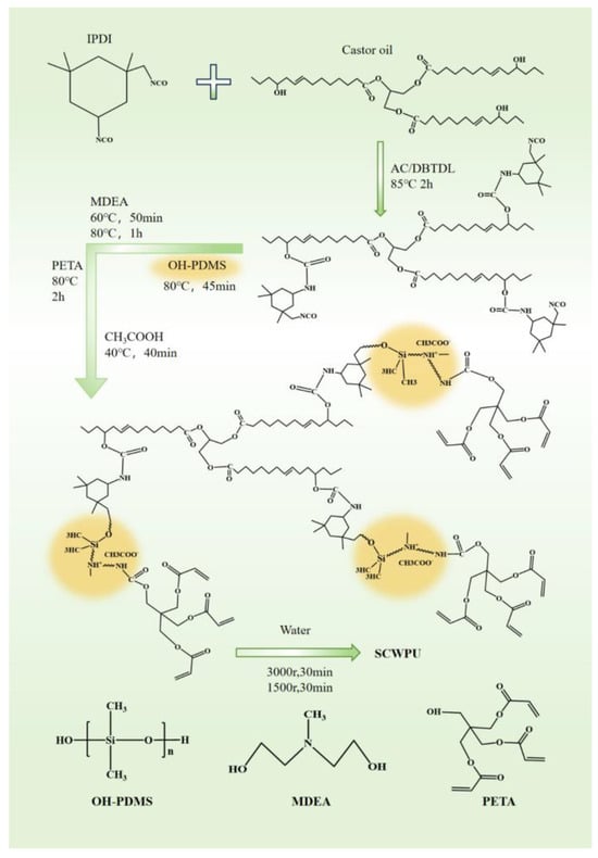 First, 51.225 g of IPDI was added to a 500 mL four-necked flask with nitrogen gas, and the flask was fitted with a spherical condenser tube, stirring paddle, and constant-pressure dropping funnel. Then, 20.715 g of C.O. was added dropwise through the funnel, and the polyurethane prepolymer solution was synthesized via reaction for 2 h at 85 °C in a constant-temperature oil bath. Next, 11 g of OH−PDMS was added dropwise, and after 30 min of reaction, the thermostatic oil bath was cooled down to 65 °C; then, 8 g of MDEA was added dropwise after 50 min of reaction, the oil bath temperature was raised to 80 °C; then, the reaction was allowed to proceed for 1 h. Next, 5 g of PETA was added dropwise as a capping agent, and the reaction was carried out for 2 h. When the proportion of the –NCO group reached the theoretical value (titrated by di-n-butylamine), the temperature was lowered to 40 °C and 4.03 g glacial acetic acid was added for 40 min to neutralize the reaction until the system was neutral. An appropriate amount of acetone was continuously added to adjust the viscosity during the reaction. Finally, distilled water was added under high-speed shear force for emulsification, and then the acetone solvent was removed by distillation under reduced pressure to prepare the SCWPU emulsion containing OH−PDMS chain segments with a solid content of about 30%. In the system, the molar ratio of n(−OH) to n(−NCO) was 0.99. In total, five groups of SCWPU emulsions were prepared, and OH−PDMS was added to the polyurethane with mass fractions of 7%, 8%, 9%, 10%, and 11%; the corresponding polyurethanes were denoted as SCWPU-7, SCWPU-8, SCWPU-9, SCWPU-10, and SCWPU-11, respectively. The reactions are presented in Figure 1.