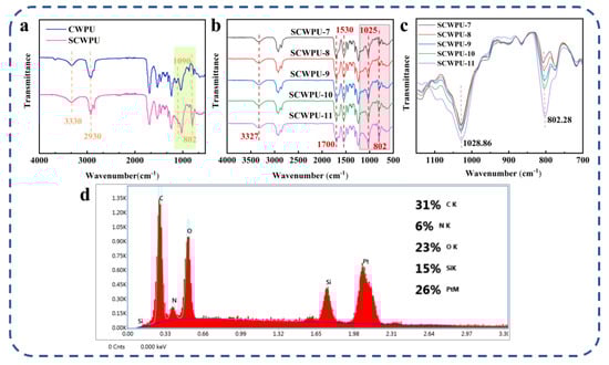 The structure and elemental composition of SCWPU were characterized using FTIR and EDS analyses (Figure 2). As shown in Figure 2a,b, the peak at 3330 cm−1 is the stretching vibration peak of N–H in the urethane moiety, and the peak at 2930 cm−1 is the stretching vibration absorption peak of C–H in the methyl group; further, the absorption peak at 1530 cm−1 is related to the stretching vibration peak of –NH in the urethane moiety, and the characteristic absorption peak of C=O appears at 1700 cm−1. These results indicate the successful synthesis of waterborne polyurethane [29]. The absence of the characteristic absorption peak of the –NCO group at 2270 cm−1 indicates that –NCO in the reaction system has been completely consumed [30]. In contrast to castor-oil-based waterborne polyurethane (CWPU), the SCWPU shows two characteristic silicone peaks at 1090 cm−1 and 802 cm−1 corresponding to the asymmetric and symmetric telescopic vibration peaks of Si–O–Si and Si–O–C, respectively, and the characteristic absorption peak of Si–CH3 appears at 1025 cm−1, indicating that a silicone-containing chain segment had been successfully introduced into the system and thus confirming the synthesis of SCWPU.