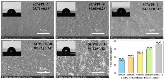 Contact angle and surface morphology of SCWPU with different OH−PDMS contents (SEM images at 10,000× magnification).
