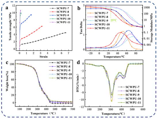Mechanical and thermomechanical properties of SCWPU: (a) stress–strain curve, (b) DMA results, (c) TG results, and (d) DTG results.