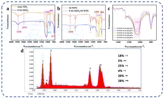 Structural and elemental characterization: (a) FTIR results for SiO2 nanoparticles before and after modification. (b) FTIR results before and after addition of FAS−SiO2 particles. (c) FTIR results for SCWPUs with different FAS−SiO2 contents. (d) EDS results for coating surface.