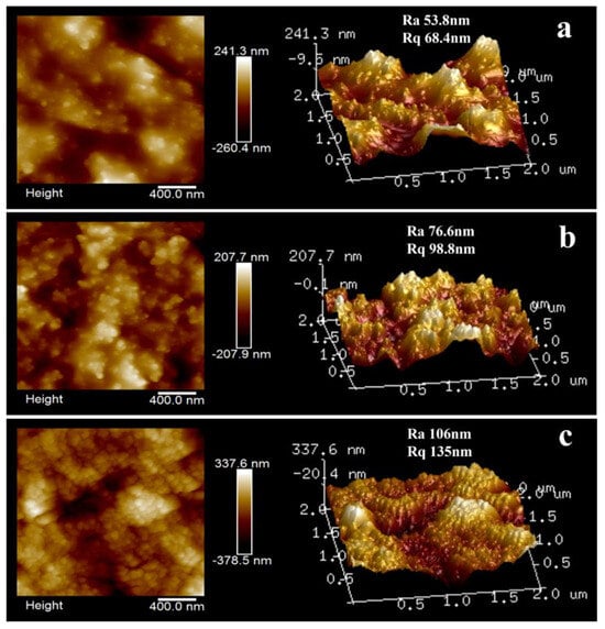 The surface morphology of several typical SCWPU/FAS−SiO2 coatings was observed using AFM. As shown in Figure 8a, the morphology of the surface of the coatings with different particle contents obviously differ. When the FAS−SiO2 content is 30%, the surface of the coatings exhibits bright adhering protrusions. These may be microscale spherical particles formed from different nanoscale FAS−SiO2 particles migrating to the surface of the coatings and being encapsulated in the SCWPU resin, as a result of which the bumps appear to be larger and unevenly dispersed, and the structures resulting in the rough surface are not dense. When the content of FAS−SiO2 particles is increased to 40%, the contrast between peaks and valleys on the surface of the coating becomes increasingly significant, the surface roughness increases, and the bumps become smaller in size and more evenly distributed on the surface of the coating. When the content of FAS−SiO2 particles is increased to 50%, clear micro- and nanostructures can be seen on the surface of the coating, and the raised particles are uniformly distributed and densely arranged, forming a micro- and nanoscale papillate structure similar to that on the surface of the lotus leaf. This is caused by the migration of fluorine-containing SiO2 particles and the synergistic effect of different particle sizes. When the FAS−SiO2 content is low, the Rq value of the coating is small; meanwhile, when the FAS−SiO2 content is increased, the Rq value increases significantly from 68.4 nm to 135 nm. Therefore, when the FAS−SiO2 content reaches 50%, the surface roughness of the coating is adequate to result in superhydrophobic structural characteristics.