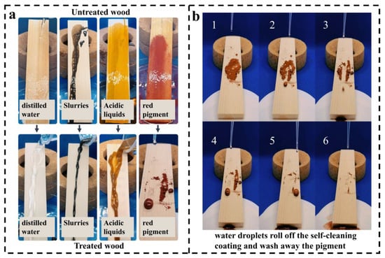 As shown in Figure 9a, the self-cleaning performance of the coatings was examined by comparing the observed sliding traces of different liquids on the surfaces of coated and uncoated wood samples [42]. Further, in Figure 9b, the self-cleaning function of the coatings was verified by uniformly spreading a brick-red color pigment on the surface of the wood and tilting the wood samples at an angle of 45°. A dropper was used to apply water dropwise onto the surface of the wood, and the water droplets were allowed to roll down continuously from the top of the wood coating [41]. This setup enables one to observe how the water droplets removed the pigment particles from the coating surface using its self-cleaning ability.