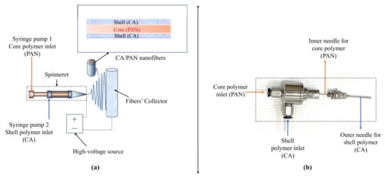 A schematic diagram of (a) core–shell electrospinning of PAN/CA nanofibers and (b) a photograph of the spinneret.