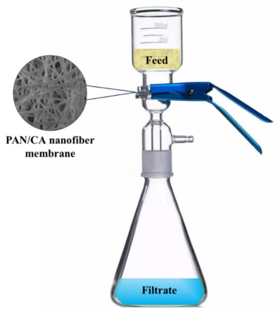 Various techniques are employed to fabricate these membranes, including phase inversion [8], coating [9], sol–gel [10], and electrospinning [7] methods. Of all these methods, electrospinning stands as a straightforward and efficient process for producing polymer-based membranes with high porosity, desirable surface properties, and exceptional permeation rates [11]. Electrospinning technology enables the fabrication of nanofibers using a diverse range of materials, either natural or synthetic polymers, such as poly(vinylidene fluoride) (PVDF) [12], polyvinyl alcohol [13], nylon 6 [14], polyethylene glycol [15], polyacrylonitrile [15], and cellulose acetate (CA) [2]. CA is considered the most important organic ester of cellulose, an abundant polymer in nature [16,17,18,19]. CA is extensively used in many applications, including plastics, coatings, and fibers, due to its advantages, including non-toxicity and low cost compared to other polymers [20].
