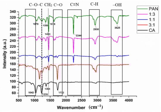 The FTIR spectra of PAN/CA nanofibers are presented in Figure 3. In pure CA nanofibers, four distinct peaks were identified. The peak observed at 1732 cm−1 is associated with the stretching of the C=O ester carbonyl [24,25], that at 1364 cm−1 is attributed to the bending vibration of the C–H bond in the acetyl groups [25], that a 1235 cm−1 arises from stretching vibrations of the C–O–C bond in acetyl groups [25,26], and the peak at 1042 cm−1 is characteristic of the C–O–C pyranose ring’s skeletal vibration [25]. CA contains both acetyl groups and hydroxyl groups. The presence of acetyl-group peaks in the FTIR spectra indicates the hydrophobic nature of pure CA nanofibers. Acetyl groups are known for their hydrophobic properties. This information is essential in studying the wettability of the nanofibers, considering their application in separation. Notably, the absence of a hydroxyl-group peak in the FTIR spectra of pure CA nanofibers suggests that the hydroxyl groups are not exposed on the surface. Hydroxyl groups are associated with hydrophilic characteristics; limited surface exposure of hydroxyl groups may contribute to the hydrophobic nature of the pure CA nanofibers.