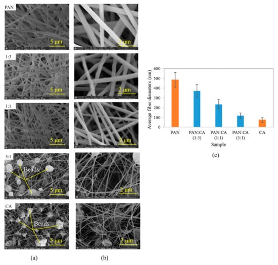 FESEM micrographs of PAN/CA nanofibers at magnifications of (a) 10 k× and (b) 30 k×, and (c) average fiber diameters of PAN/CA nanofibers.