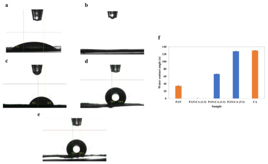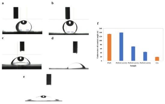 Surface hydrophilicity–hydrophobicity is an essential factor determining the applications of PAN/CA nanofibers. Figure 6 shows images of water droplets on PAN/CA nanofibers and the water contact angle of PAN/CA nanofibers. Figure 6a shows that nanofibers containing pure PAN were highly hydrophilic with a water contact angle of 33.9°. This hydrophilicity of PAN nanofibers is mainly attributed to the presence of –OH groups within PAN nanofibers, evident in the significantly high intensity of –OH functional group as observed in the corresponding FTIR spectra (Figure 3). In contrast, the water contact angle of pure CA nanofibers was approximately 129.6° (Figure 6e). The molecular structure of CA comprises both hydrophilic hydroxyl groups and hydrophobic groups, with the hydrophilic groups not being exposed on the surface of pure CA nanofibers [22].