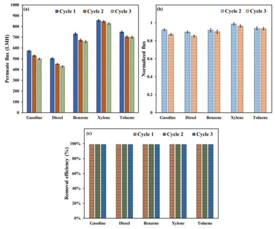 The membranes’ performance was investigated by separating five different oils (gasoline, diesel, benzene, xylene, and toluene) from water. The hydrophilic membrane that showed the best hydrophilic–oleophobic properties, i.e., the membrane with a composition of 1:3 PAN to CA, was utilized for the separation experiments. Figure 8a illustrates the water permeate flux for the different oil–water mixtures over three filtration cycles. The permeate flux measurements under gravity conditions were between 429.2 and 857.2 L m−2 h−1 (LMH), implying that the synthesized membranes fall in the range of ultrafiltration and microfiltration membranes. It can be seen that the lowest flux measurements were obtained for the diesel/water mixture, and the maximum flux was obtained for the xylene/water mixture. The differences in flux measurements depend on many factors, such as the physical properties of the oil, including density and viscosity. Moreover, the chemical interaction between the oil droplets/particles and the surface of the membrane and the deposition rate of oil particles onto the membrane surface affect the permeate flux measurements.