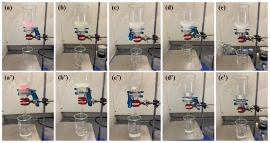 Images capturing the transformation of oil–water emulsions, both pre- and post-filtration, using the PAN/CA nanofiber membrane. Showing the emulsions of gasoline (a,a’), diesel (b,b’), benzene (c,c’), xylene (d,d’), and toluene (e,e’).