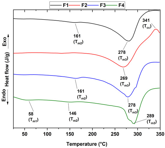 | Tg (°C) | Tm1 (°C) | Tm2 (°C) | Tm3 (°C) | Tcc (°C) | |
