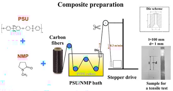 The impregnation process was carried out as described in Figure 1: a homemade PTFE bath with three rotatable PTFE guide rollers fixed in it was filled with a PSU solution of the desired concentration (20, 30, or 40 wt.%). Carbon fiber yarns were passed through the bath of the PSU solution. Flattening the carbon fibers onto PTFE rollers allowed PSU to penetrate into the bundles’ internal volume, resulting in a more uniform polymer distribution. At the top of the bath, a PTFE die with an internal diameter of 1.6 mm was fixed. Using a stepper drive, the carbon fibers were pulled through the die and excess polymer was removed at the die. The stepper drive’s rotation provided a linear speed of fiber passage through the bath equal to 0.3 m/min. When the length of the impregnated composites reached 1.5 m, the stepper drive stopped, and the impregnated yarns were wound on a metallic frame and dried at 115 °C for 4 h to remove solvent in a Binder FD-115 dryer (BINDER GmbH, Tuttlingen, Germany). Additionally, part of the dried composites was fixed on a metallic plate and held at 350 °C for 30 min in a furnace in an air atmosphere to additionally remove residual solvent.