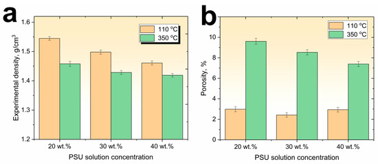 Figure 2 shows the results of a study of the experimental density and the calculated porosity values of the PSU/CF composites. As expected, since the density of PSU is lower than the density of the carbon fibers, the density of the composites produced using a solution of a higher PSU concentration is lower for all the composites. So, if composites produced using a 20 wt.% PSU solution have an average experimental density of 1.54 g/cm3, the composites produced using 30 and 40 wt.% PSU solutions have average density values of 1.49 g/cm3 and 1.46 g/cm3, respectively.