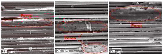 It was found that the density of the composites after heating to 350 °C also decreased, and at a maximum concentration of the PSU solution of 40 wt.%, the density of the composites decreased from a value of 1.46 g/cm3 after drying at 110 °C to a value of 1.42 g/cm3 after heating to 350 °C. The reason for the observed decrease in the density values is pore formation processes as a result of boiling off the residual solvent during heating to polysulfone processing temperatures. Since it is known that the boiling point of n-methylpyrrolidone is 202 °C [58], when heated above these temperatures, the amount (3–5%) of residual n-methylpyrrolidone begins to boil away and is removed from the composite material, forming additional voids in the volume of the composite material. This is confirmed by an increase in the porosity of the composites after high temperature treatment (Figure 2b). So, for composites after drying at 110 °C the porosity values are in the range of 2.5–3% after post-heating to 350 °C, the porosity values increase up to 9.6, 8.5, and 7.3% for composites impregnated with 20, 30, and 40 wt.% polymer solutions, respectively. It can be seen that for the composites heated to 350 °C, an increase in the concentration of the PSU solution results in a decrease of porosity values because at a higher PSU solution concentration, a smaller volume of residual solvent remains in the composites. Therefore, when it boils away, fewer pores are formed. N-methylpyrrolidone forms a porous structure of the polymer while being removed from the composites volume (Figure 3), especially in the areas where a thick layer of polysulfone was formed between the carbon fiber bundles during the composite’s production. As it can be seen from the SEM images, the porosity of the produced composites is formed by two factors, including voids formed between individual carbon fiber filaments in the areas depleted of polymer, as well as pores formed directly in the volume of the polymer matrix when the solvent is removed. This means that using a higher polymer solution concentration reduces the factors that increase the porosity of the composites.