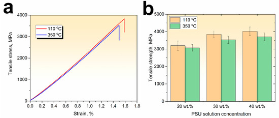 To study the effect of the fiber to matrix ratio and thermal post-processing methods of the PSU/CF composites on their mechanical properties, tensile tests were performed. Figure 4a shows the tensile stress–strain curves of the 30 wt.% PSU solution impregnated unidirectional carbon fiber yarns fabricated under different conditions. The stress–strain curves of both composites (dried at 110 °C and heated at 350 °C) have a similar behavior: a nonlinear initial section up to a stress range of about 200 MPa, where the Young’s modulus increases from 180 to 220 GPa because of non-uniform loading of the CF filaments at the initial stage of the tensile tests. A further increase in the load and deformation up to the PSU yield point results in the polymer matrix beginning to flow in the direction of the applied load, allowing alignment of individual CF bundles achieving higher Young’s modulus values. It should be noted that the Young’s modulus of the composites is very close to the carbon fibers’ Young’s modulus. In addition, there was no noticeable difference between the Young’s modulus values of the composites impregnated with various PSU solution concentrations, which means good stress transfer ability of the polymer matrix regardless of the impregnation solution concentration used.