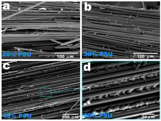 SEM images of the unidirectional carbon fiber yarns impregnated with 20 wt.% (a), 30 wt.% (b), and 40 wt.% (c,d) PSU solution.