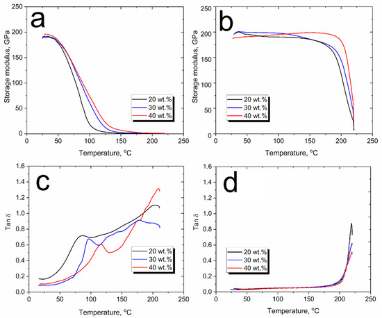 DMA results of the unidirectional carbon fiber yarns impregnated with 20 wt.%, 30 wt.%, and 40 wt.% PSU solution after drying at 110 °C (a,c) and heating to 350 °C (b,d).
