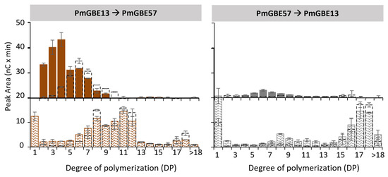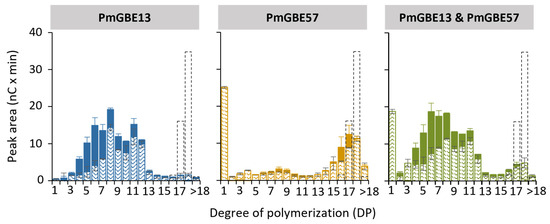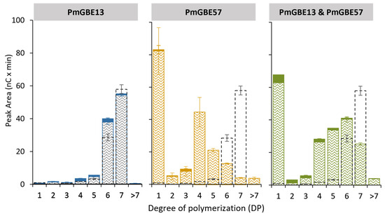 Peak areas of MD7 in linear (pattern fill) and branched chains (solid fill) after treatment with PmGBE13, PmGBE57, or PmGBE13 and PmGBE57 (Petrotoga mobilis) at 1 UB/g S for 24 h compared to the untreated substrate (dotted lines). The peak area of branched chains is calculated by the increase in peak area after debranching of 24 h GBE-modified samples minus the peak area of the 24 h GBE-modified samples before debranching.