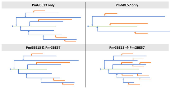 Simplified models of α-glucan structures after modification with PmGBE13 only, PmGBE57 only, PmGBE13 and PmGBE57 in a one-step modification or PmGBE13 and PmGBE57 in a two-step modification, based on the results obtained on chain length distribution by HPAEC. Blue dots represent the reducing end of each α-glucan molecule, green lines indicate the linear backbone chains carrying the reducing end, blue lines show long substituted branches, and orange lines show external branches.
