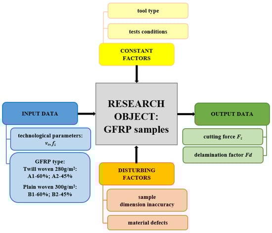 The aim of this study was to investigate the influence of selected technological drilling parameters (the cutting speed vc and the feed per tooth fz) and different types of GFRP materials (differing in fiber type and the wf ratios of reinforced material) on the cutting forces and delamination in this process, in order to obtain high-quality drilled holes. Optimal technological parameters for GFRP drilling, that meet quality requirements can be determined based on these results. Figure 1 illustrates the applied research plan.