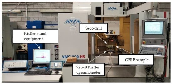 A WaterJet Combo abrasive water jet cutter was used to cut the GFRP plates into samples for drilling. The samples had the dimensions 35 mm × 250 mm and the thickness of the sample depended on the type of composite. A total of 10 holes were drilled in each sample within the distance of 25 mm between the axis of the holes. A vertical machining center Avia VMC800HS (Avia, Warsaw, Poland) was used for drilling holes, and coolant was not applied. The drilling process was carried out using a 2-edge carbide diamond coated drill (SD205A-12.726-56-14R1-C2) of diameter 12.726 mm produced by Seco (Erkrath, Germany). During the tests, holes in the samples made of different types of GFRPs were drilled with variable drilling parameters: cutting speeds vc = 91, 182, 273, and 364 m/min and feeds per tooth fz = 0.04, 0.08, 0.12, and 0.16 mm/tooth. The drilling process was carried out without cooling. The technological parameters of drilling used in the tests were selected based on the results of preliminary tests. Five repetitions were performed for each parameter. In order to measure the cutting forces during the drilling process, a specially designed test stand was used. The test stand consists of 9257B dynamometer from Kistler (Winterthur, Switzerland), for measuring the components of cutting forces in three axes Fx, Fy, Fz, a signal conditioning system, a DAQ module with an integrated A/D card, and dedicated software (Figure 2).