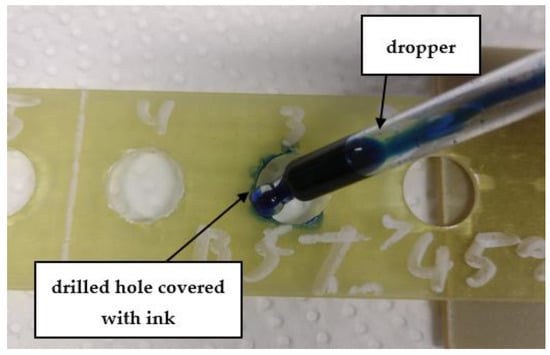 Hole delamination was examined using a new ink method. The method consists of covering the surface of the hole with a colored liquid that spreads over the inner surface of the hole using a dropper. The method of covering the surface of the holes with ink is shown in Figure 3. The ink should be spread evenly over the hole surface. The liquid covers the surface, and damage is induced in the material inside the hole. In addition, the liquid penetrates into the delaminated area of the material, causing it to change its color. It is recommended to repeat the covering of the surface with ink, to cover all the delaminated areas. After applying each of two layers, wait 15 min for the ink to penetrate the delamination. After drying, clean the upper and lower surfaces of the sample from excess ink by wiping it with a cloth soaked in ethyl alcohol.