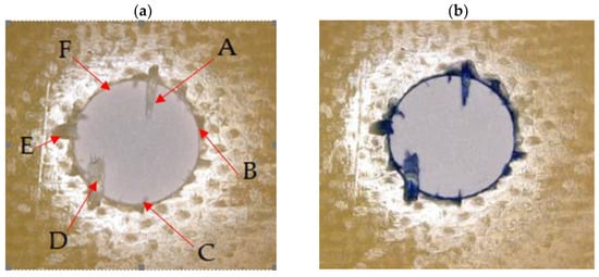 Images of peel-up delamination of holes drilled in material A1. (a) Clear delamination image, (b) liquid-colored delamination, with marked damages: A—spalling and pulled out fibers; B—spalling; C—pulled out fibers; D—spalling and matrix debonding; E—spalling and uncut fibers; F—uncut fibers.
