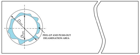 where —delamination factor; —maximum delaminated diameter drawn from the centerline of the hole; and —nominal diameter (according to Figure 5).