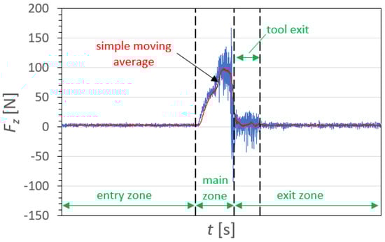 An example of the characteristics of the course of changes in the cutting force component Fz as a function of the time t for sample A1, in a drilling process conducted with vc = 273 m/min and fz = 0.12 mm/tooth, is shown in Figure 6. It can be observed that the cutting force component Fz (also known as a feed force or thrust force) takes both positive and negative values. Fz plays a major role in the drilling process. Other components of the cutting force Fx and Fy take lower values, which was confirmed by the research presented in [], which concerned GFRP composites manufactured based on the same fibers as in this paper with a range of different technological parameters. Three zones can be identified in the force course: the entry zone, main drilling zone, and exit zone. At the beginning of the process, in the entry zone, the cutting force oscillates around 0 N, taking the lowest values below 10 N. In the main drilling zone, the drill enters the workpiece, causing an almost linear increase in the cutting force component Fz, and its value stabilizes over time due to full engagement of the cutting edges []. This is followed by a decrease in the cutting force component Fz due to fewer layers to be cut. In the exit zone, the tool exits the workpiece, which causes a decrease in the cutting force component Fz. Periodic peaks can be observed in the force curve when the composite fibers are cut. Figure 6 also shows the Simple Moving Average (SMA) to smooth the Fz course pattern.