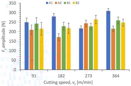 The relationship between different cutting speeds vc and the cutting force component Fz amplitude for four types of GFRP materials drilled with a constant feed per tooth of fz = 0.12 mm/tooth is shown in Figure 7. The maximum value of the cutting force component Fz amplitude was obtained at the highest value of the cutting speed vc for material A1 and was equal to 309 N. The minimum value of 171 N was obtained for the A2 material at the cutting speed vc equal to 182 m/min. A comparison of the samples made of the same material but differing with the wf ratios of reinforced material reveals the following relationships. For almost every cutting speed value (except vc = 273 m/min), there is a noticeable decrease in the cutting forces component Fz for the A2 material. For the cutting speed vc = 91 m/min, the difference in the Fz values of the two materials is 16%, for vc = 182 m/min it is 38%, and for vc = 364 m/min it is 30%. This is due to the fact that for the A1 material containing a higher value of the weight fraction ratio of reinforced material, the forces needed to drill a hole and overcome the resistance of the fibers are higher than for the composite with a lower wf. An increase in the fiber volume fraction increases the thrust forces []. Considering the amplitudes of the cutting force component Fz for materials B1 and B2, taking into account the standard deviation, we cannot conclude that there are significant differences between the values obtained for these two materials characterized by different wf ratios of reinforced material.