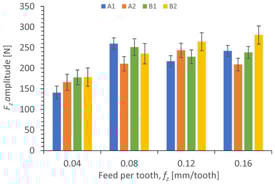 Figure 8 shows the effect of feed per tooth fz on the cutting force component Fz amplitude for different types of GFRPs. For each tested material, the amplitude of the cutting force component Fz increases with increasing the feed per tooth fz. Other studies [] also found that the feed rate had the greatest impact on the cutting force in drilling. The lowest amplitude values of the cutting force component Fz were achieved for the lowest tested feed per tooth value of 0.04 mm/tooth for all tested materials (A1 = 140 N, A2 = 165 N, B1 = 177 N, B2 = 178 N), similar to in study []. A comparison of the lowest (fz = 0.04 mm/tooth) and the highest feed per tooth (fz = 0.16 mm/tooth) demonstrates that the highest increase in the cutting force component Fz amplitude (about 71%) was obtained for material A1, then for B2 (57%), and finally for B1 (34%), while it was the smallest for A2 (the amplitude value increased by about 26%). This means that the feed per tooth has the smallest impact on the cutting force component Fz for the A2 material made of twill fibers and with a lower wf ratio of reinforced material. Increasing the feed rate increases the material removal rate (MRR) for all tested materials. The higher MRR means a higher volume to cut, which leads to higher friction because of the higher contact area between the cutting tool face and the workpiece causing the higher force.